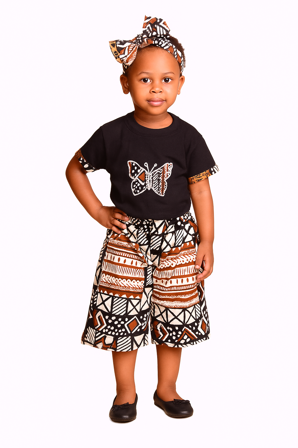 The set features rich African geometric and tribal-inspired prints in earthy tones of black, white, and brown, contrasted by the butterfly motif on the T-shirt for a playful, stylish finish.