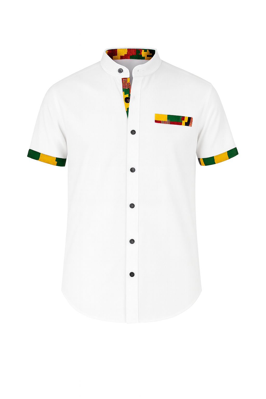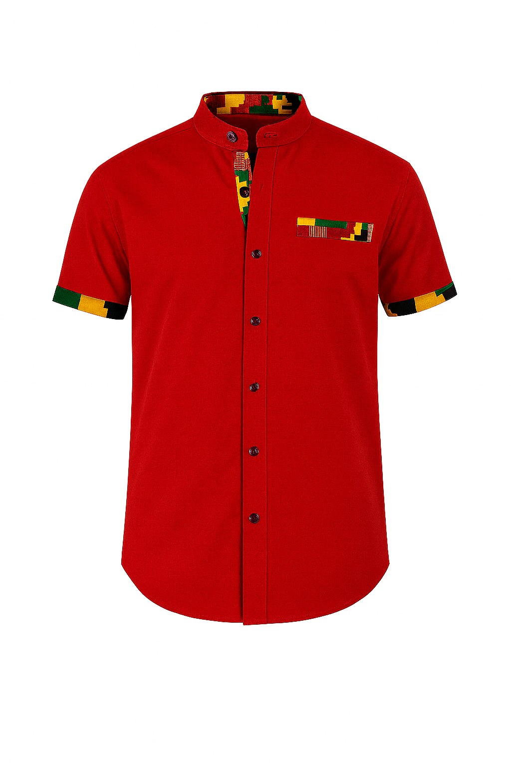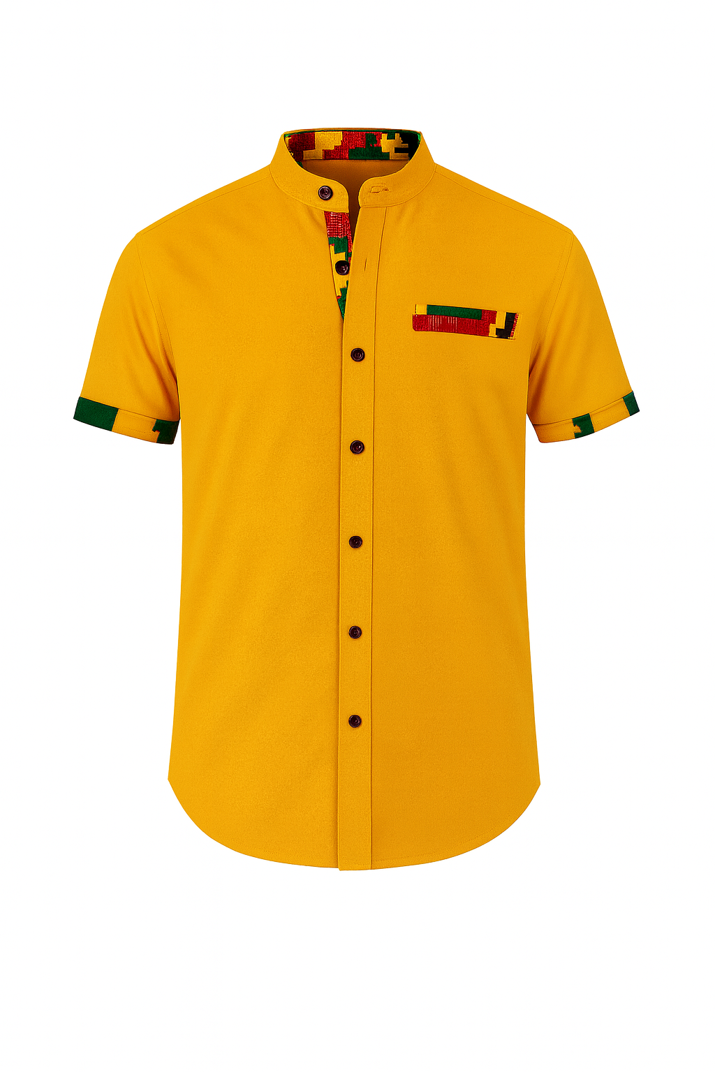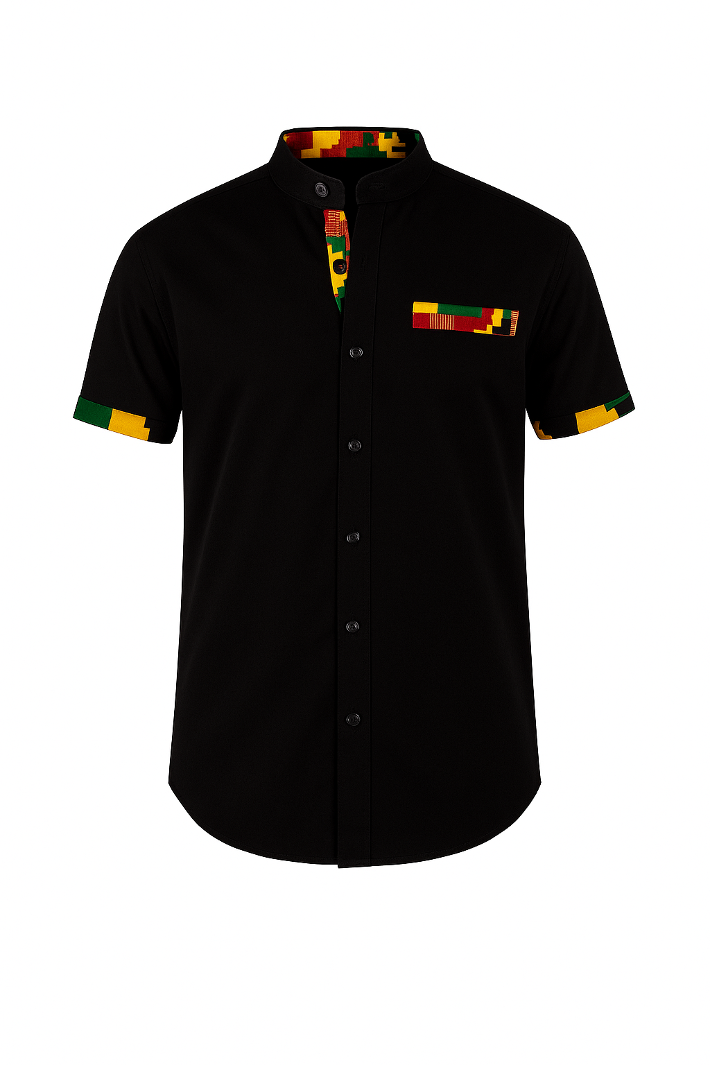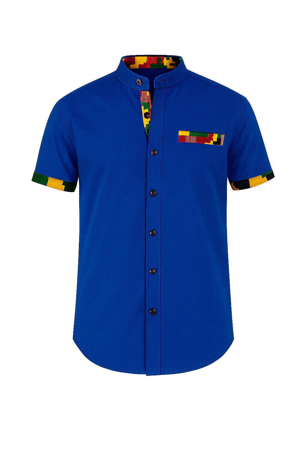 Our wholesale African Men’s Kitenge Trim Shirts feature a sleek mandarin-style collar, clean button-down front, and professionally placed Kitenge trims on the collar edge, placket, chest pocket, and sleeve cuffs.