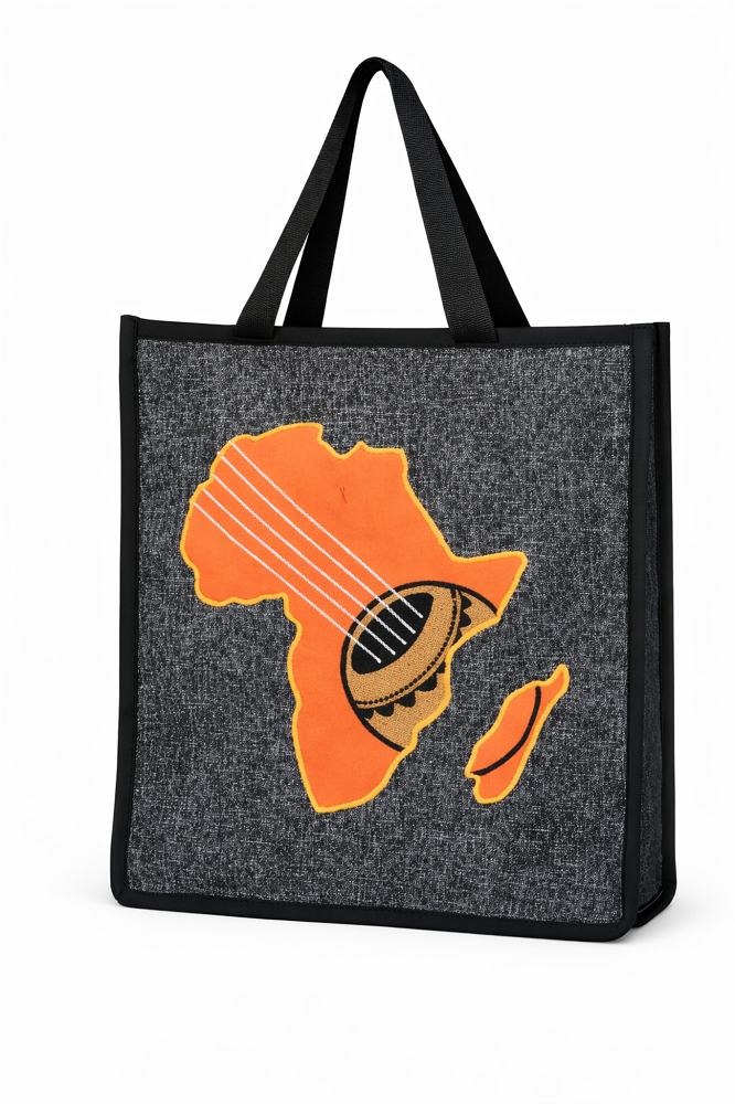 African culture–inspired tote bags featuring music symbolism and Africa map design; ideal for museum gift shops, music stores, festival vendors, safari lodge retailers, university bookstores, cultural NGOs, corporate gifting suppliers, and online heritage marketplaces.