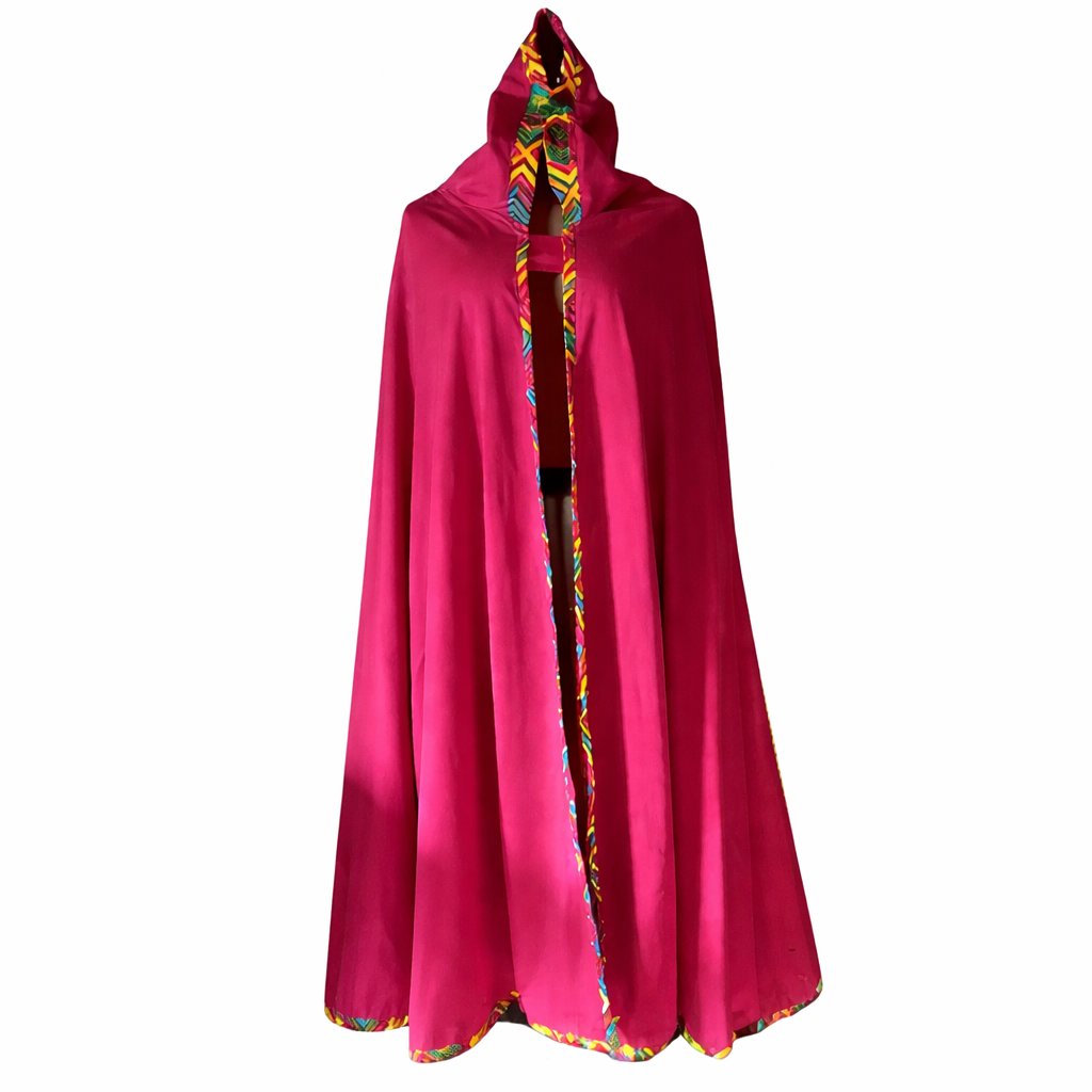 The Wholesale Afrocentric Long Hooded Poncho is designed for professional fashion buyers seeking bold cultural outerwear with strong visual presence and retail distinction. Crafted in a flowing full-length silhouette, this hooded poncho features a rich deep pink base accented with vibrant multicolor African print trim along the front opening, hood lining, and hemline—creating a striking contrast that commands attention in any retail display.