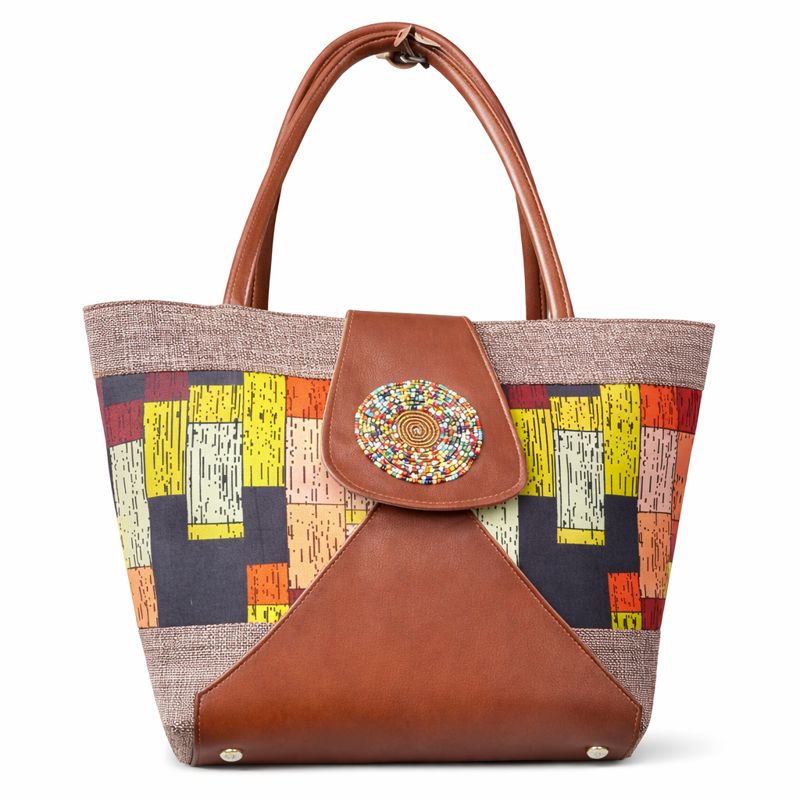 The Artisan Roots African Tote Bags blend structured elegance with cultural depth. A warm brown leather base and matching leather shoulder handles establish a premium foundation, immediately communicating quality and long-term usability. The central body panel features an African-inspired geometric fabric pattern composed of layered rectangular and linear motifs in earthy tones of mustard yellow, burnt orange, charcoal, muted red, and cream. This pattern arrangement creates a balanced rhythm that feels both contemporary and rooted in tradition.