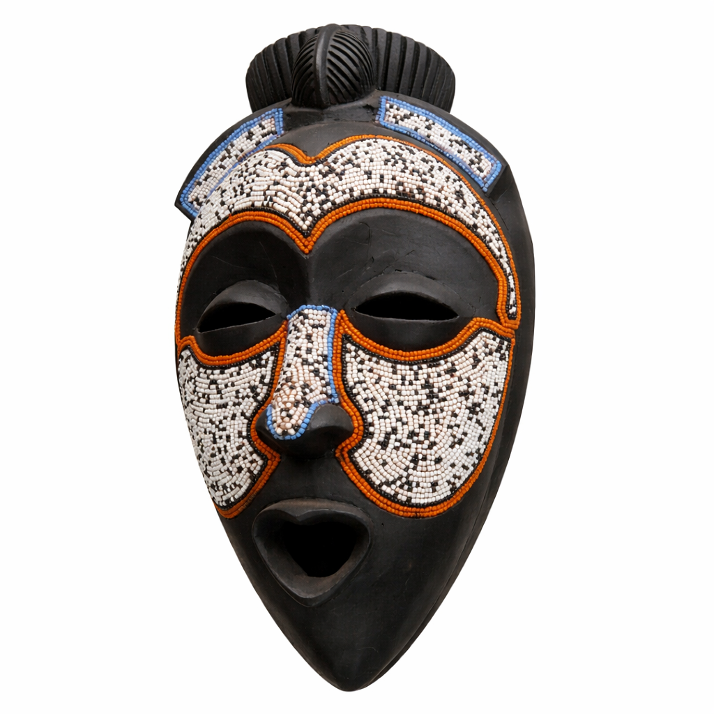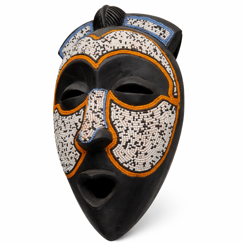 Carved mask base, hand-applied glass beadwork, artisan finishing