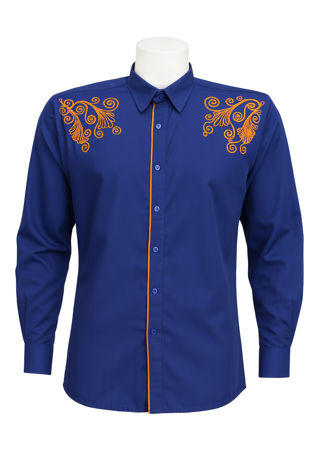 Each shirt features intricate spiral flower embroidery stitched in a vibrant orange tone on a deep royal blue background. The embroidery, located on both shoulders, symbolizes energy and continuity — hallmarks of African artistry. The straight button-down design with matching orange piping down the front creates a clean and modern silhouette.