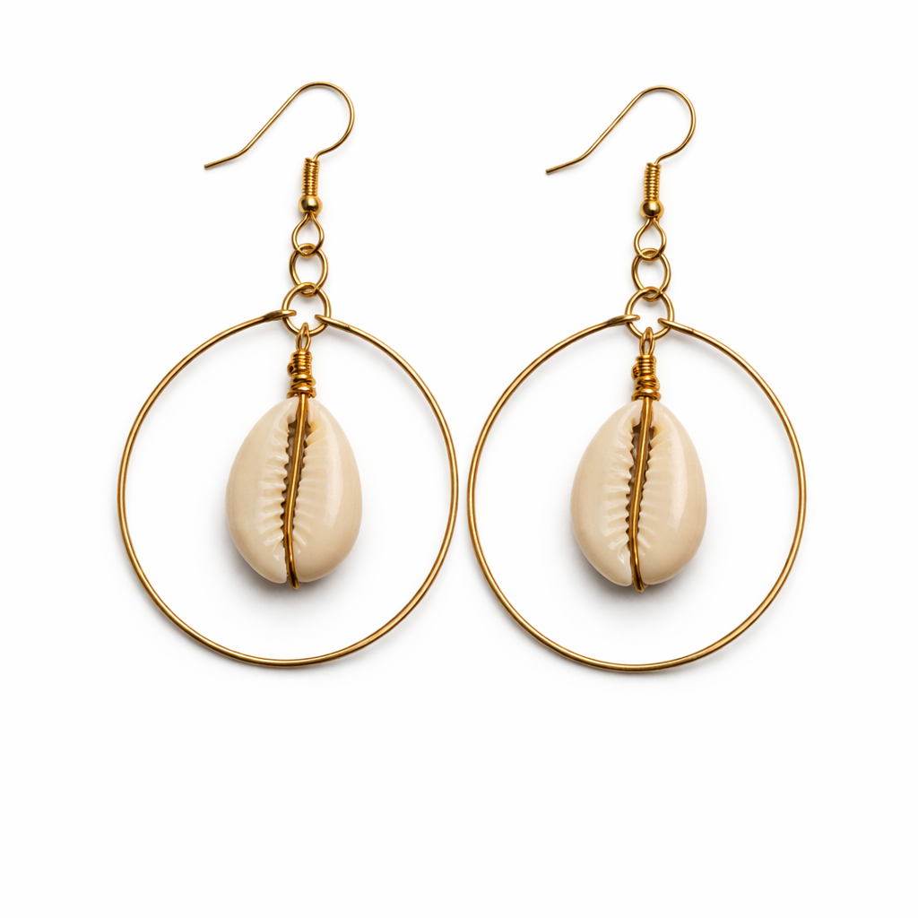 Featuring a natural cowrie shell suspended within a clean brass hoop, this design blends heritage symbolism with modern minimalism. The Wholesale African Cowrie Shell Hoop Earrings are easy to merchandise, seasonless, and highly attractive to both local and international customers.