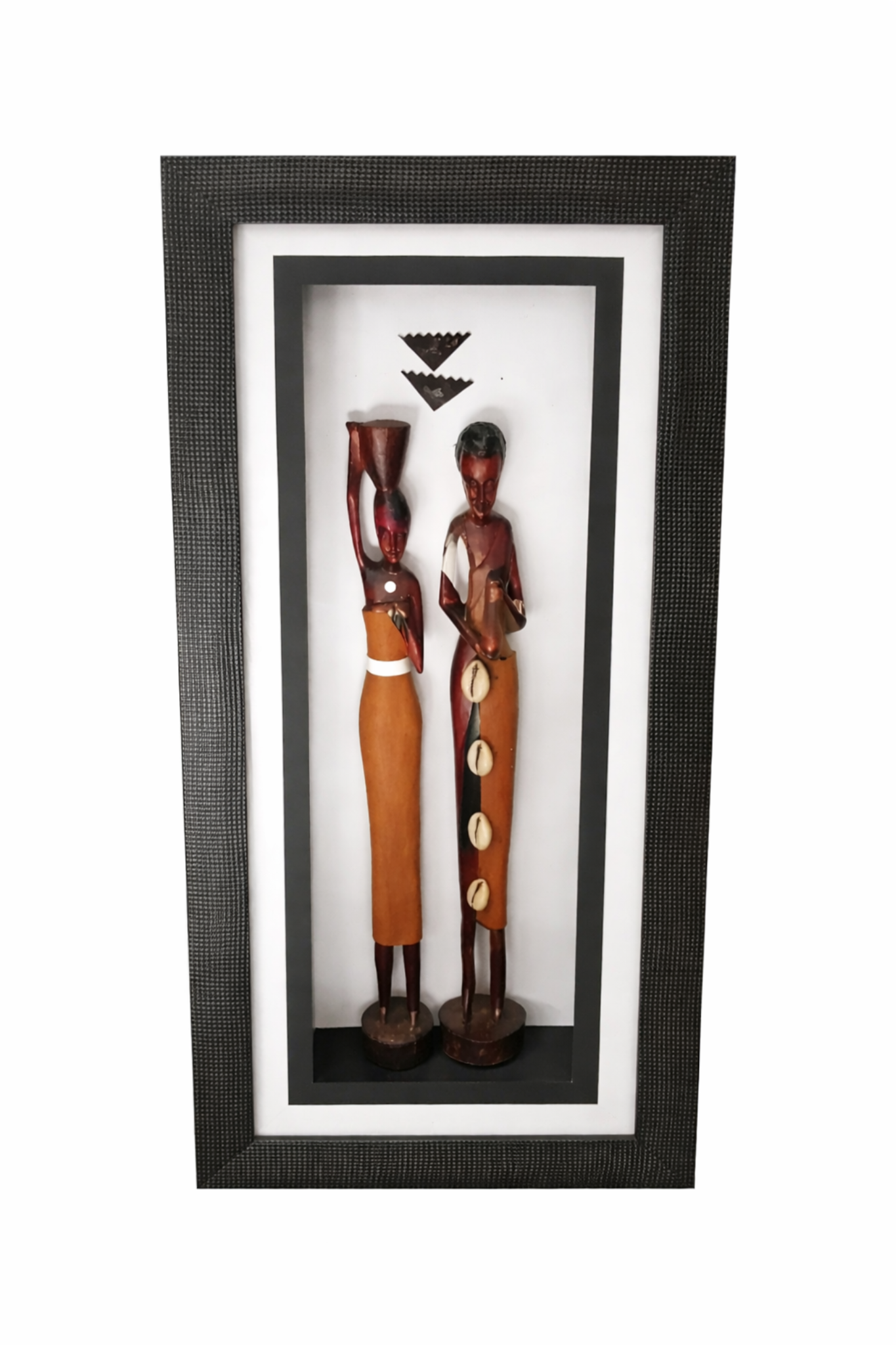 Hand-carved wood figures, cowrie shell accents, framed backing, artisan finishing