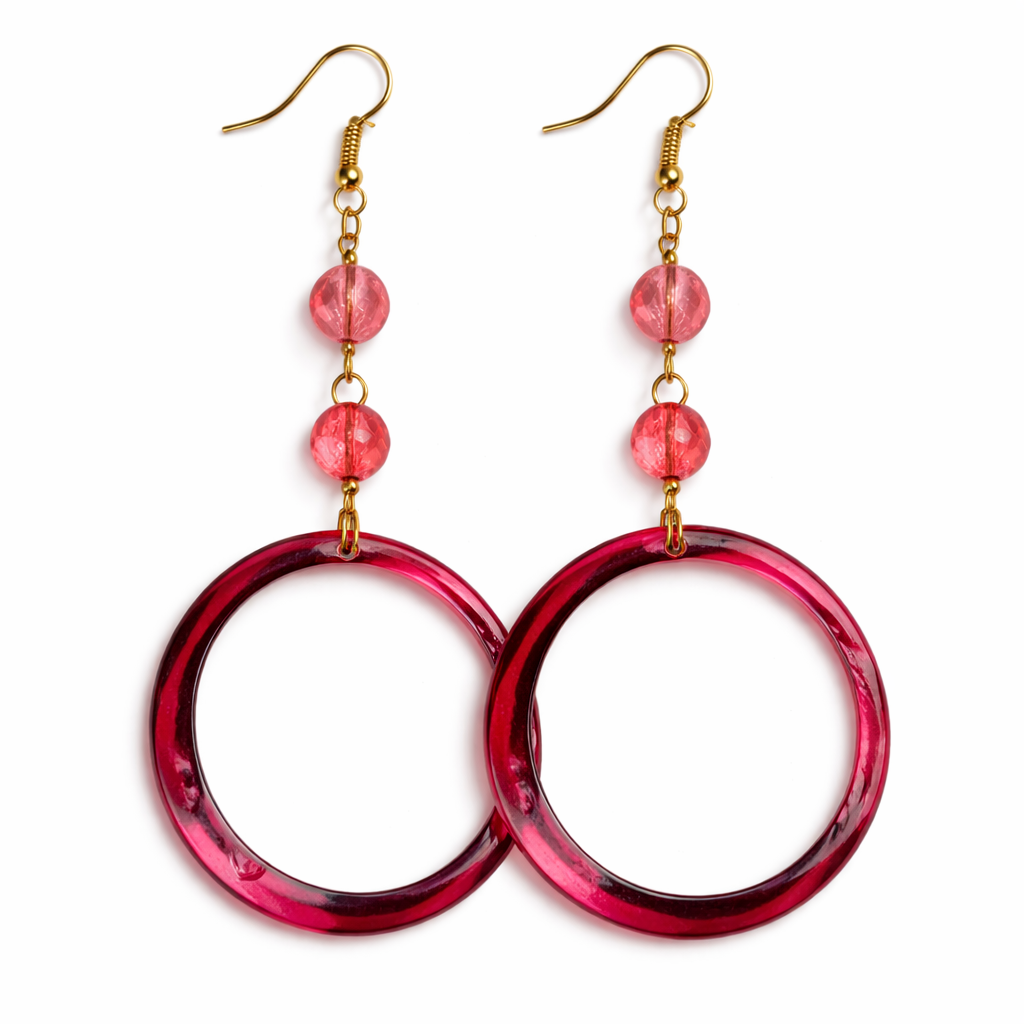 Elevate your jewelry assortment with Wholesale Red Resin Hoop Beaded Drop Earrings. Featuring translucent crimson resin hoops, faceted red bead accents, and gold-tone detailing, these bold statement earrings are ideal for resort boutiques, museum gift shops, and fashion retailers. MOQ 100 pairs with worldwide delivery available. Customization supported; email info@africanscreative.com.