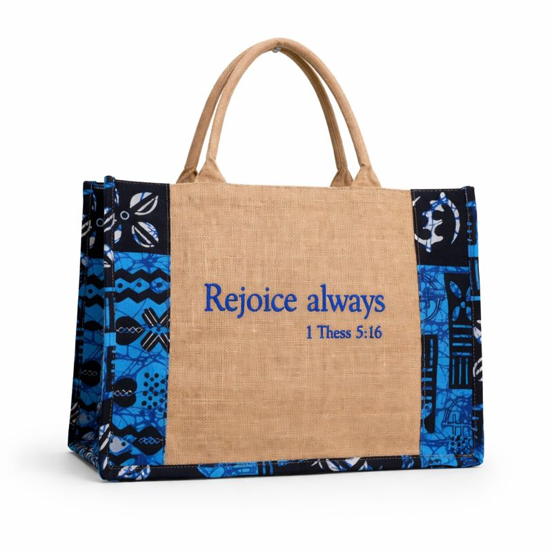 Wholesale Christian Scripture Jute Tote Bag handcrafted from natural jute with inspirational Bible verses and African print accents. Ideal for churches, bookstores & gifts. MOQ 10pcs, worldwide delivery. Customize via info@africanscreative.com