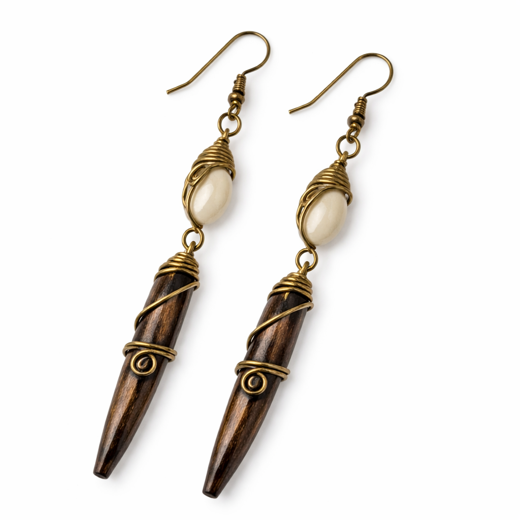 The Wholesale Handcrafted African Horn & Cowrie Shell Spike Drop Earrings are designed for professional jewelry buyers seeking bold Afrocentric statement pieces that combine heritage symbolism with refined artisan construction. Featuring a polished ivory cowrie shell accent and elongated horn spike pendant wrapped in decorative gold-tone wire, these earrings deliver sculptural drama, natural texture, and strong retail presence.