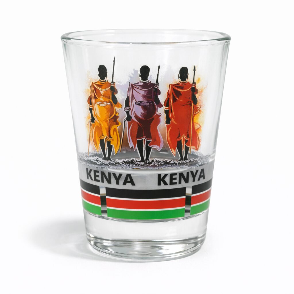 The Sunset Maasai Kenya Shot Glass is a striking souvenir piece featuring vivid Maasai warrior silhouettes set against warm sunset tones, complemented by the iconic Kenyan flag band. Designed for both collectors and everyday use, the Sunset Maasai Kenya Shot Glass delivers a unique cultural narrative that resonates strongly with tourists and gift buyers.