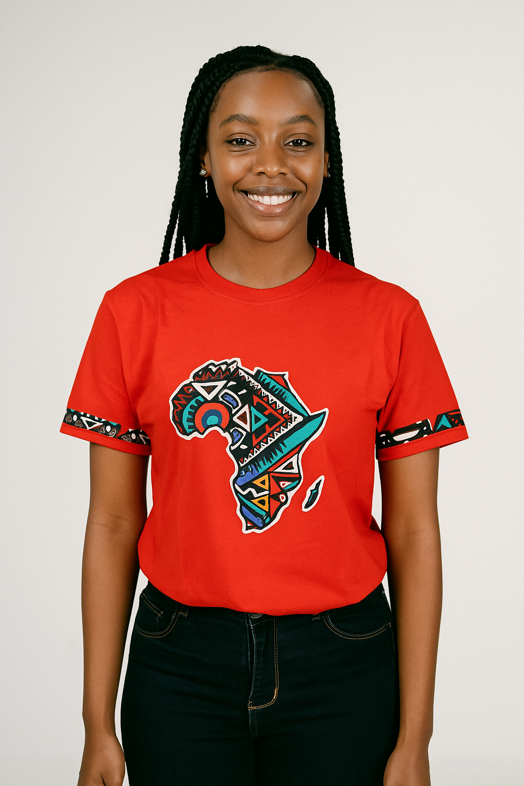 The Wholesale Africa Map T-Shirts feature a striking Africa-shaped print filled with intricate geometric tribal motifs, creating a bold yet elegant statement of unity and pride. The design highlights Africa’s rich cultural diversity through its vibrant patterns, bringing together colors, textures, and artistry that speak to the soul. The base red cotton fabric adds a dynamic contrast, amplifying the authenticity and warmth of African creativity. Ideal for gifting, cultural events, and global retail displays, these T-shirts allow wearers to carry a piece of Africa wherever they go.