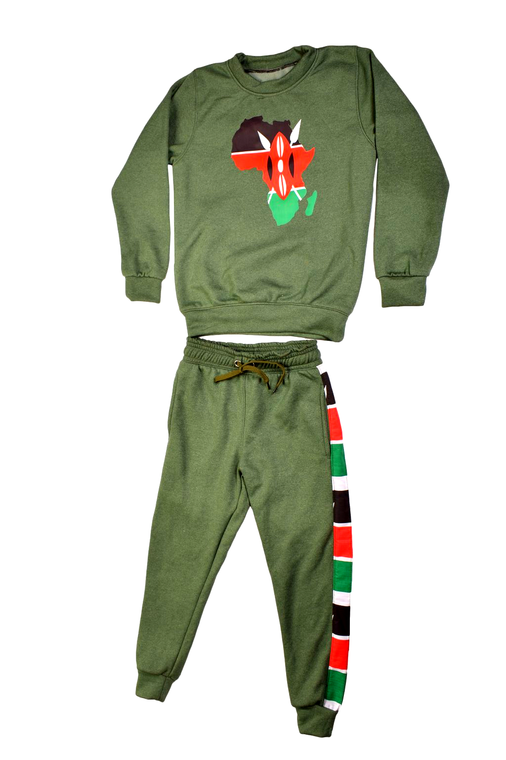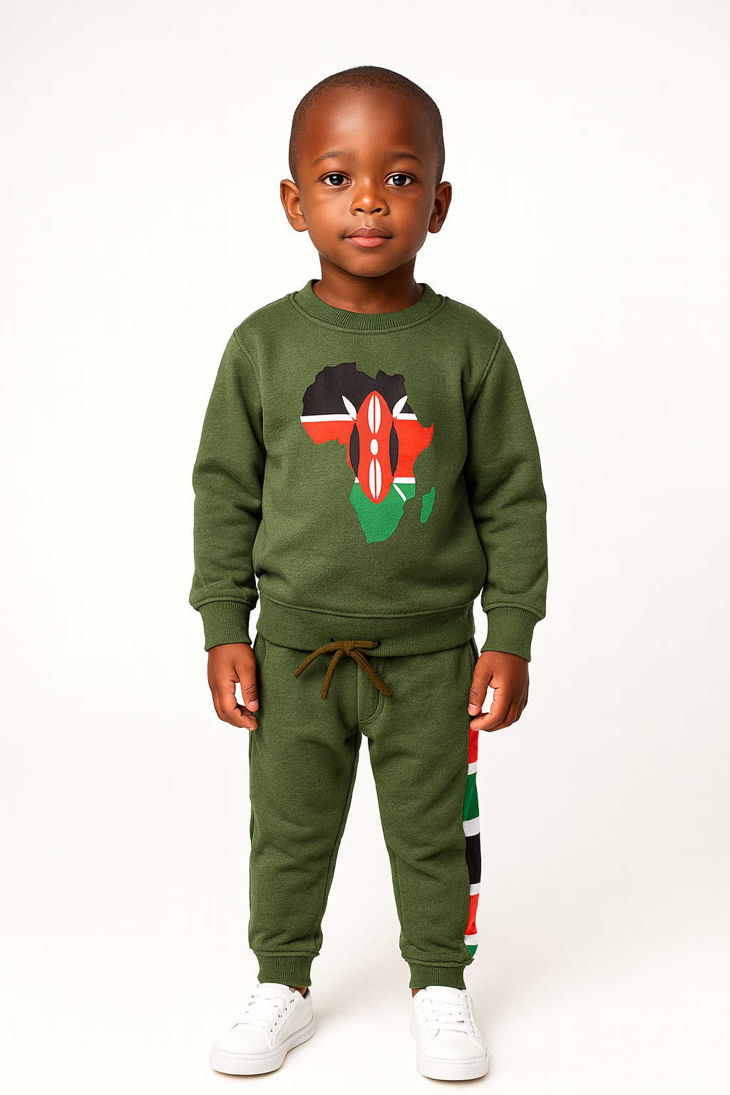 This sweatsuit features a Kenyan flag + Africa map print prominently displayed on the sweatshirt front, symbolizing unity, pride, and heritage. The joggers include a side panel stripe inspired by the Kenyan flag colors: black, white, red, and green, adding vibrant visual contrast. The pattern is placed with intention, so the outfit stands out without overwhelming the child’s comfort or mobility.