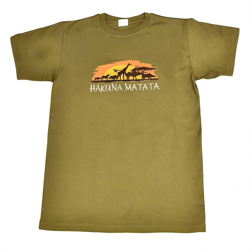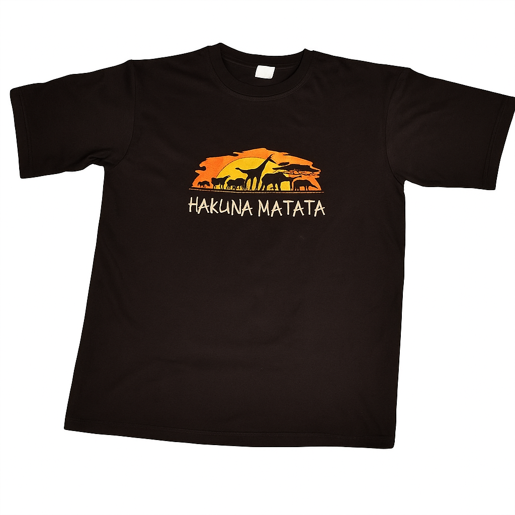 Step into Africa’s carefree vibe with Wholesale Assorted Hakuna Matata T-Shirts, embroidered with wildlife and sunset scenes. 100% cotton, unisex, assorted colors, MOQ 10, worldwide delivery, customizable via info@africanscreative.com.