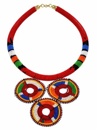 Add bold African style to your collection with the Maasai Beaded Triple Disc Statement Necklace. Handmade artisan jewelry with vibrant beadwork, perfect for boutiques and gift shops. Retail price per piece with wholesale pricing from 10 pieces. Worldwide delivery available. Contact info@africanscreative.com for bulk orders.