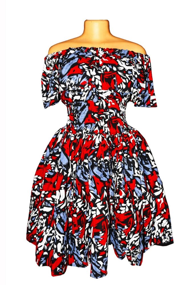 Shop wholesale off-shoulder skater dresses in assorted African prints. Free size, minimum 10 pieces, $15 per item