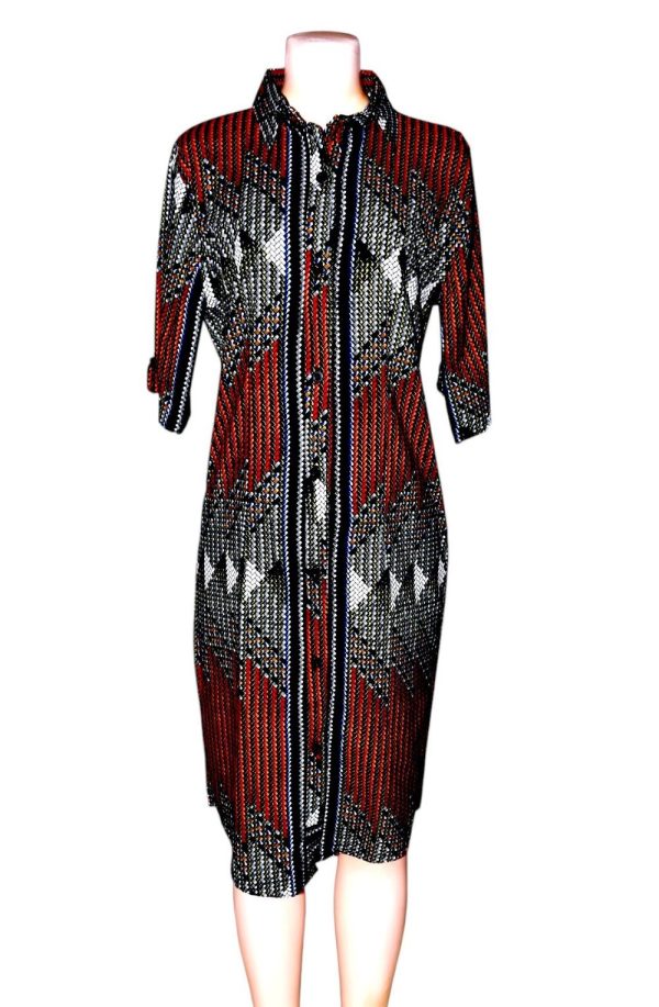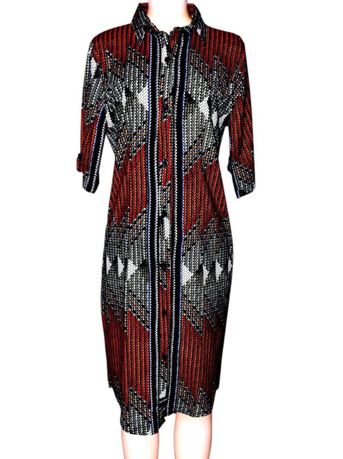 Women’s long-sleeve and mid-sleeve African print button-down shirt dress, suitable for everyday wear, retail collections, and cultural fashion displays.